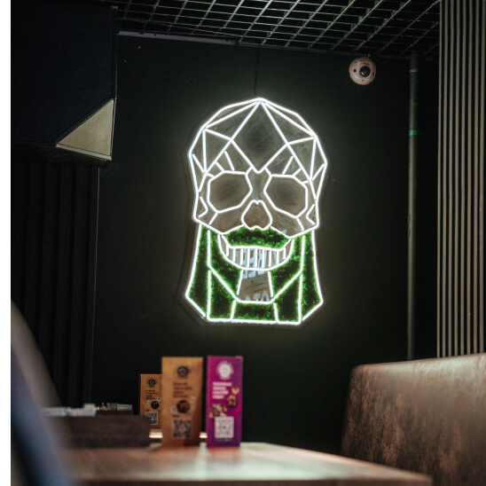 Плюсы: стеклянный неон создает винтажный эффект и отлично сочетается практически с любым интерьером.