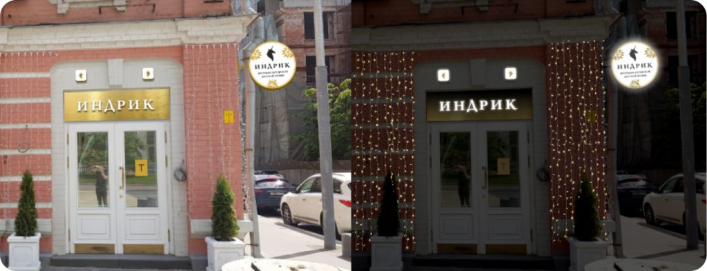 Подходящими материалами для фасадной вывески являются нержавеющая сталь, алюминий и акрил. Подсветка, чаще всего выбирается контражурная, приглушенная, чтобы подчеркнуть изысканность и индивидуальность заведения. А сами стены дополнительно подсвечиваются фасадными светильниками или гирляндами